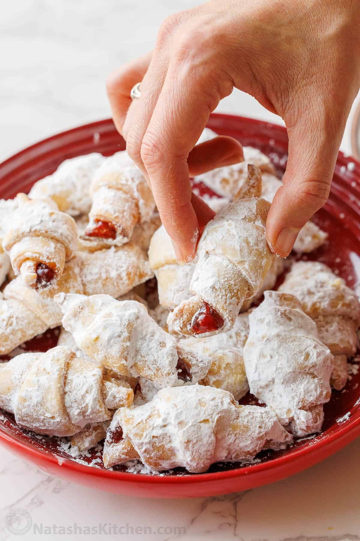 This easy Rugelach Cookies recipe makes flaky, soft, and perfect crescent-shaped pastries filled with sweet jam and dusted with powdered sugar. They are really simple