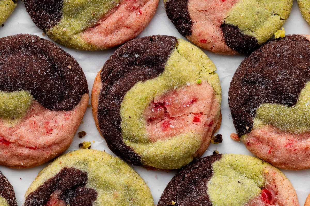 These marbled spumoni cookies bring together pistachio, cherry, and chocolate—all in one eye-catching, chewy, ultra-colorful cookie. They’re soft-baked with slightly crisp edges, gorgeous swirls, and