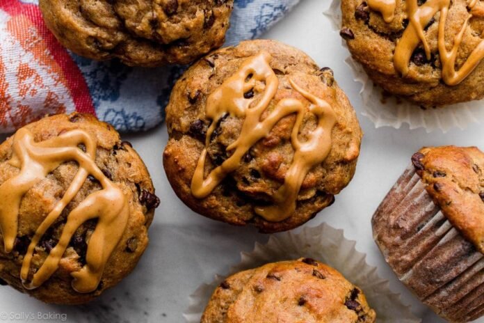 healthier peanut butter banana muffins with mini chocolate chips and blue linen napkin.