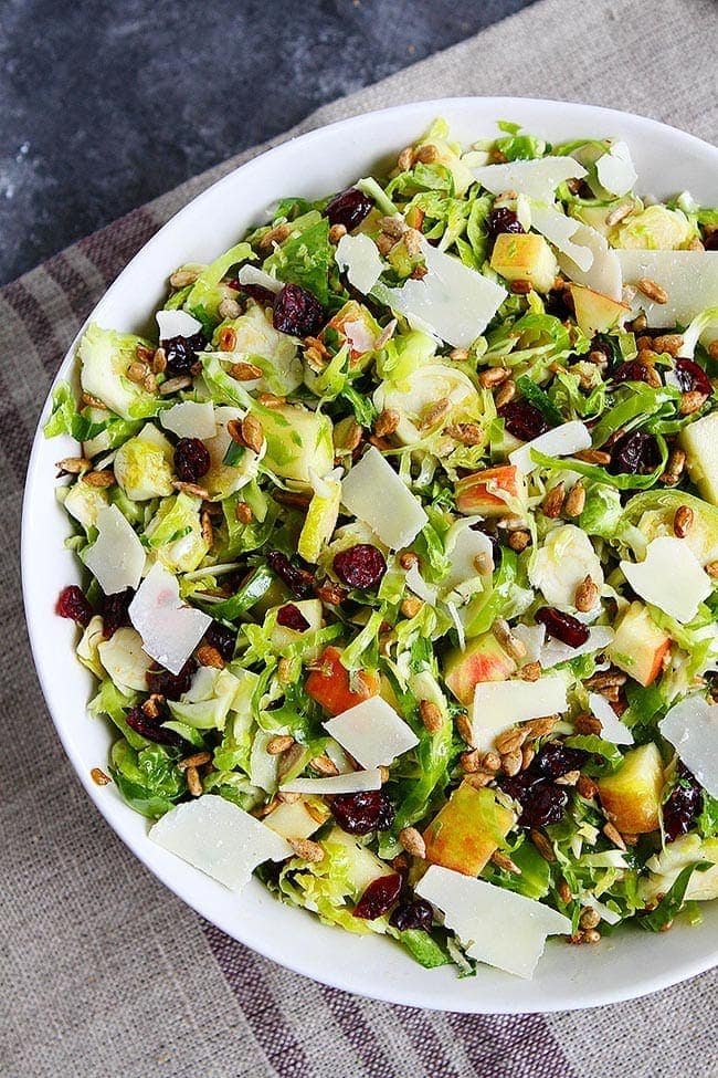I make this Shaved Brussels Sprouts Salad every fall. It is crisp, colorful, and full of fall flavor! Thinly shaved Brussels sprouts are tossed with sweet apples, tart dried cranberries, crunchy sunflower seeds, and savory Parmesan, all coated in a maple Dijon dressing.