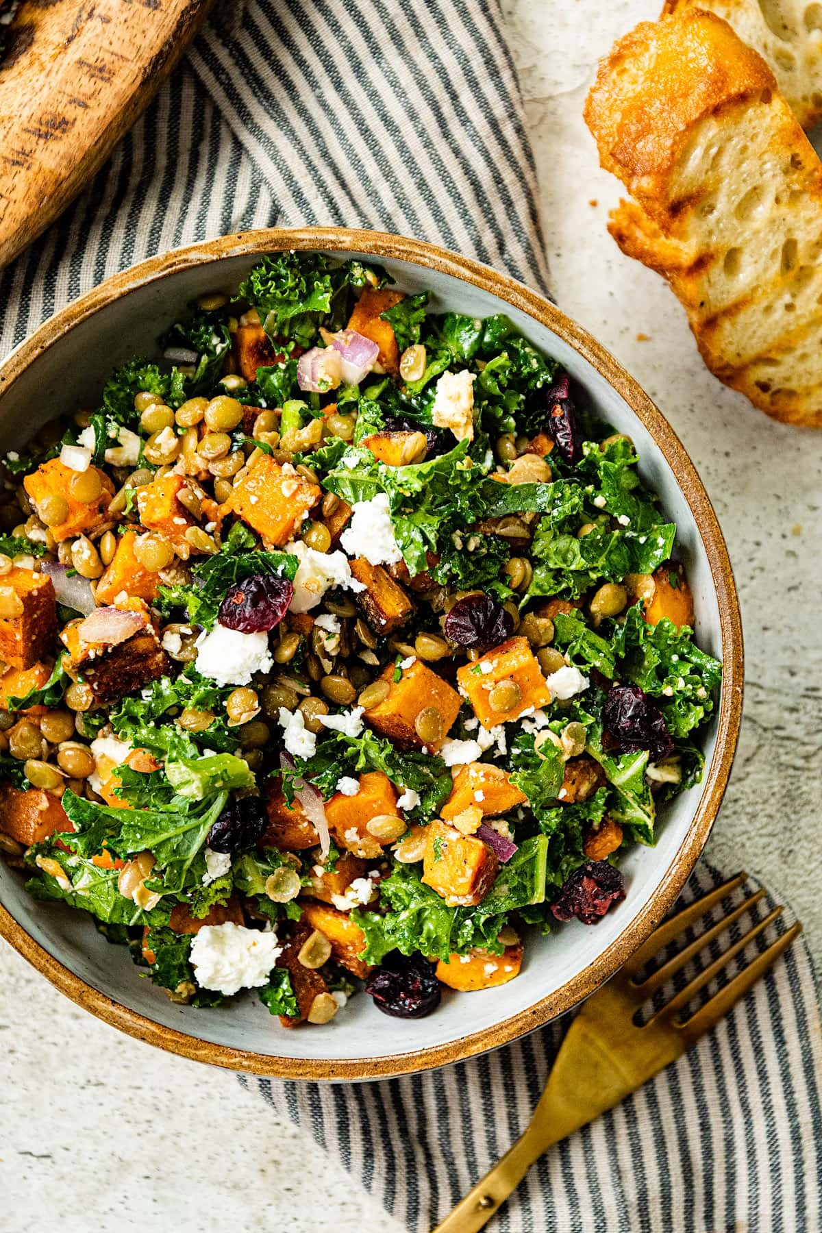 This hearty and healthy Sweet Potato Lentil Salad is made with roasted sweet potatoes, lentils, kale, feta cheese, red onion, dried cranberries, and finished with a balsamic maple mustard dressing.
