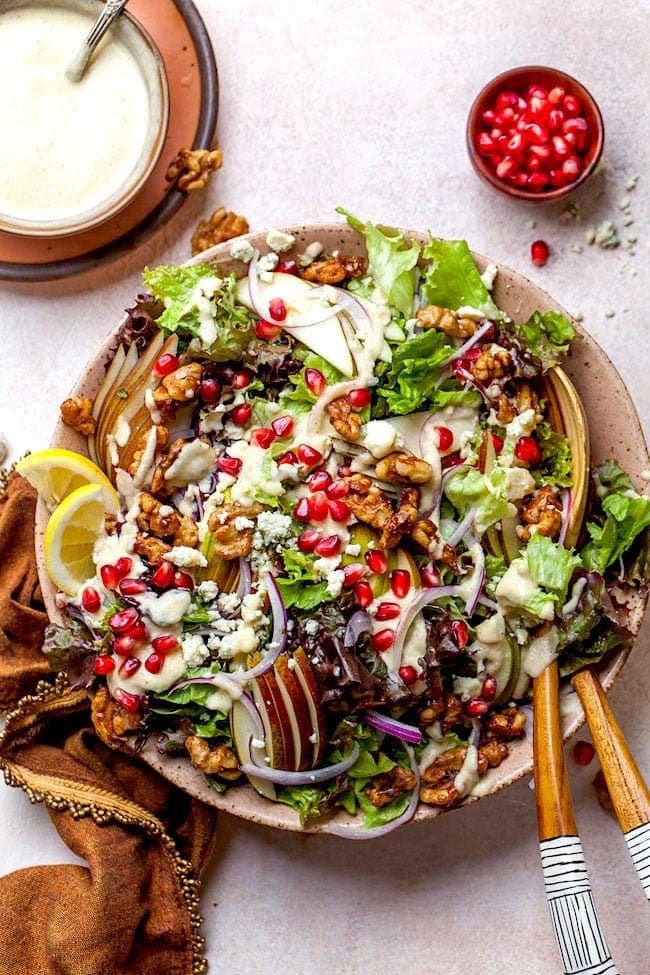 This Pear Salad is a holiday showstopper! Sweet roasted pear vinaigrette coats crisp greens, juicy pears, crunchy candied walnuts, tangy blue cheese, and bright pomegranate arils, creating a stunning salad that’s perfect for festive dinners or a light lunch.