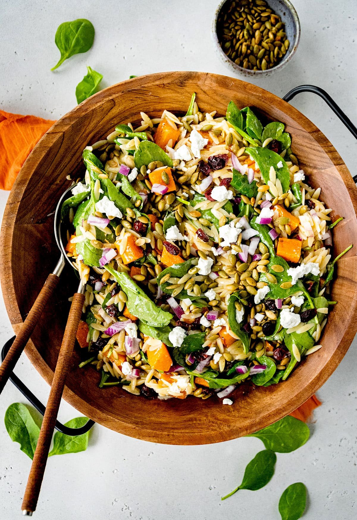 This Roasted Butternut Squash Orzo Salad is hearty, colorful, and full of fall flavors! Tender orzo is tossed with roasted squash, fresh spinach, tart dried cranberries, crisp red onion, crunchy pepitas, and creamy goat cheese, making it a perfectly satisfying salad for the season.