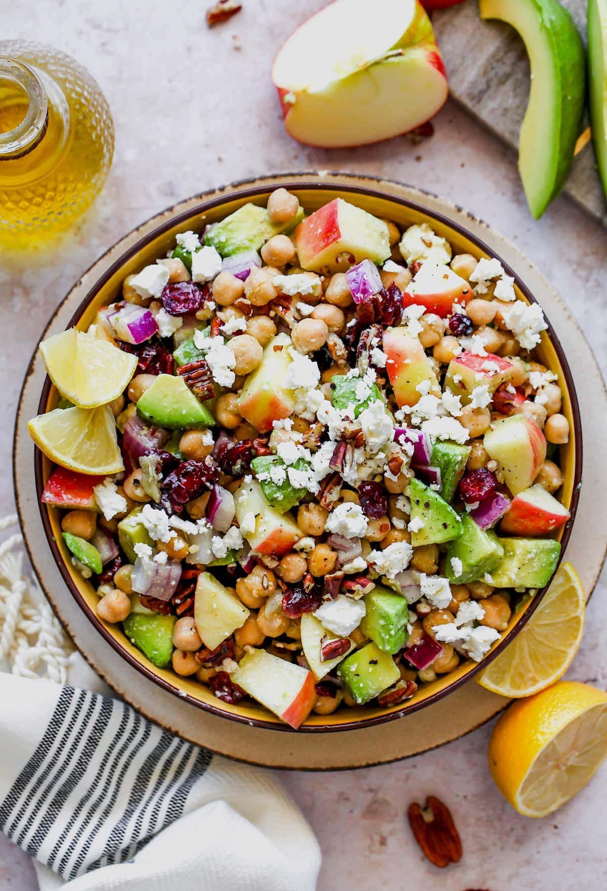 This Fall Chickpea Salad is healthy, hearty, and full of fall flavors! Chickpeas are tossed with crisp apple, creamy avocado, dried cranberries, crunchy pecans, red onion, and tangy feta in a light apple cider dressing. I love this one for a simple lunch!