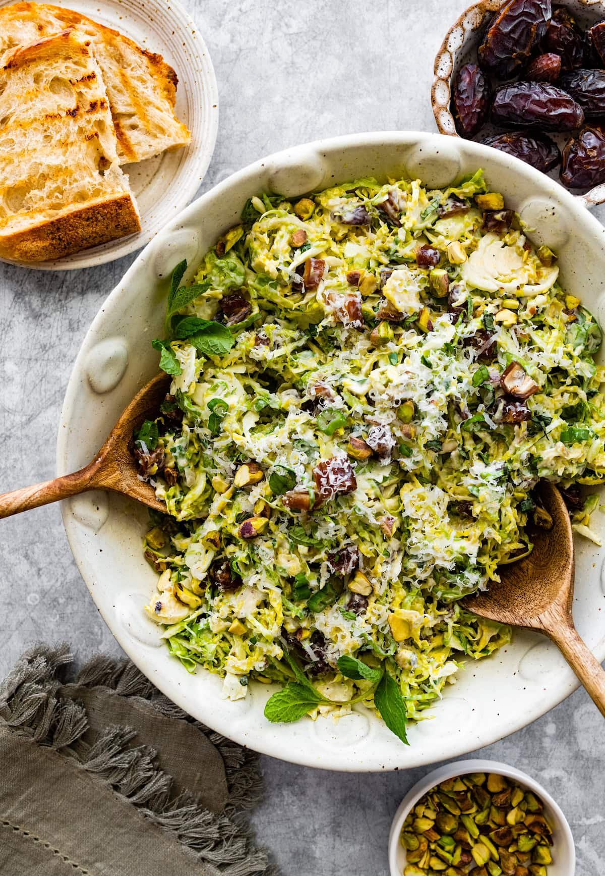 Brussels Sprouts Salad with Dates, Parmesan Cheese, Pistachios & Creamy Lemon Dressing