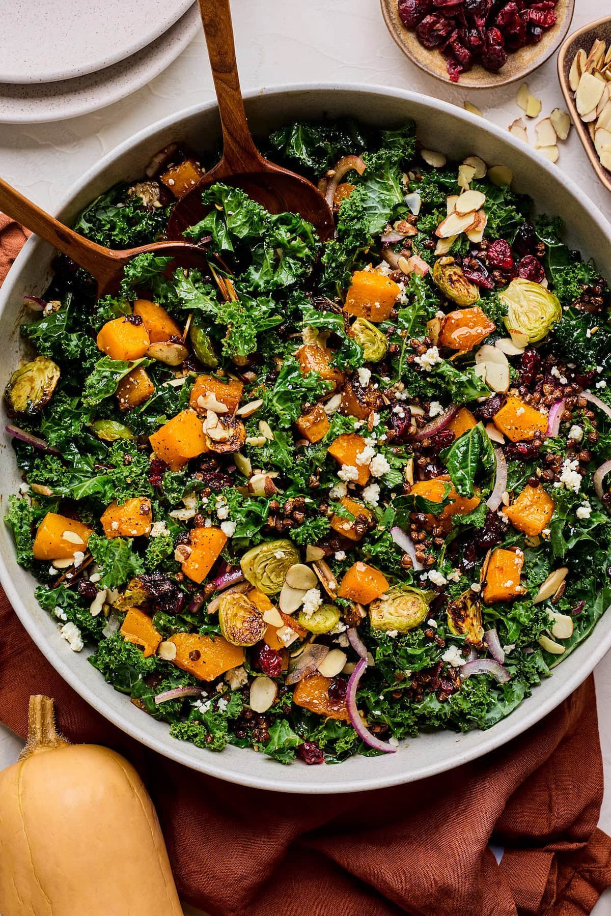 This Kale Salad with Roasted Vegetables & Crispy Lentils is hearty, flavorful, and full of seasonal goodness! Tender kale is combined with roasted butternut squash and Brussels sprouts, crispy lentils, dried cranberries, tangy feta, sliced almonds, and red onion, all tossed in a maple balsamic dressing. A perfect salad for fall, winter, or Thanksgiving!