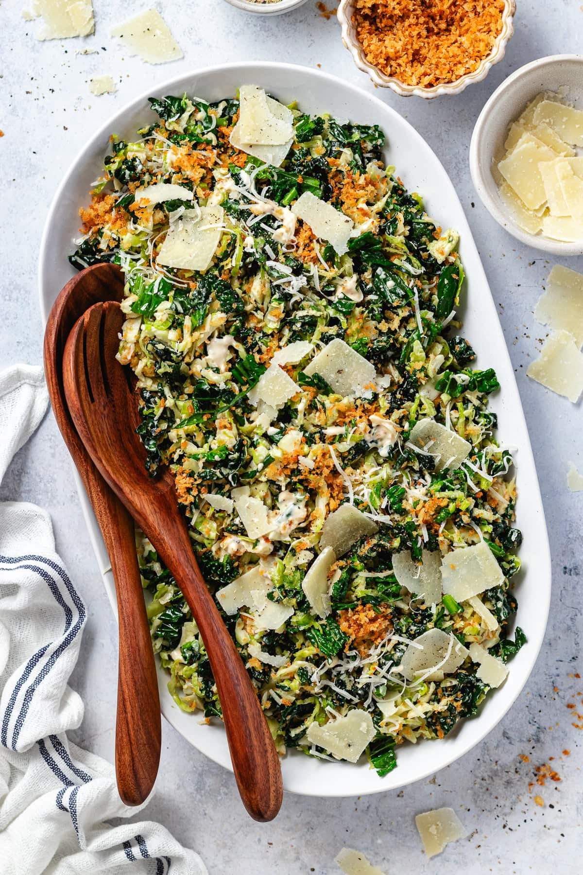 This Brussels Sprouts Kale Caesar Salad is a hearty twist on the classic! Shredded Brussels sprouts and kale are tossed with toasted buttery breadcrumbs and Parmesan in a creamy homemade Caesar dressing, creating a flavorful and satisfying salad you’ll love.