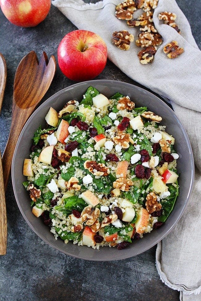 This Apple Walnut Quinoa Salad is hearty, wholesome, and full of fall flavors! Quinoa and fresh spinach are tossed with sweet apples, dried cranberries, creamy goat cheese, and a simple maple mustard dressing, creating a deliciously satisfying salad that’s perfect for fall.