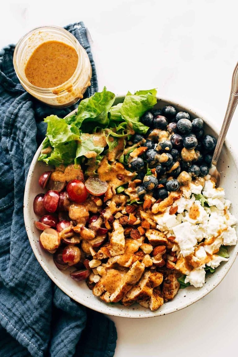 Tender chicken, plump grapes and berries, crisp lettuce, tangy feta cheese, crunchy almonds, and the real star – almond honey mustard dressing! Eat the rainbow and be glad, friends!