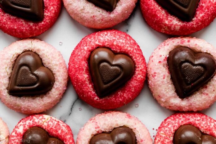 With a chocolate heart candy nestled on top, these super soft sweetheart peanut butter Valentine’s Day cookies are the February version of peanut butter blossoms.
