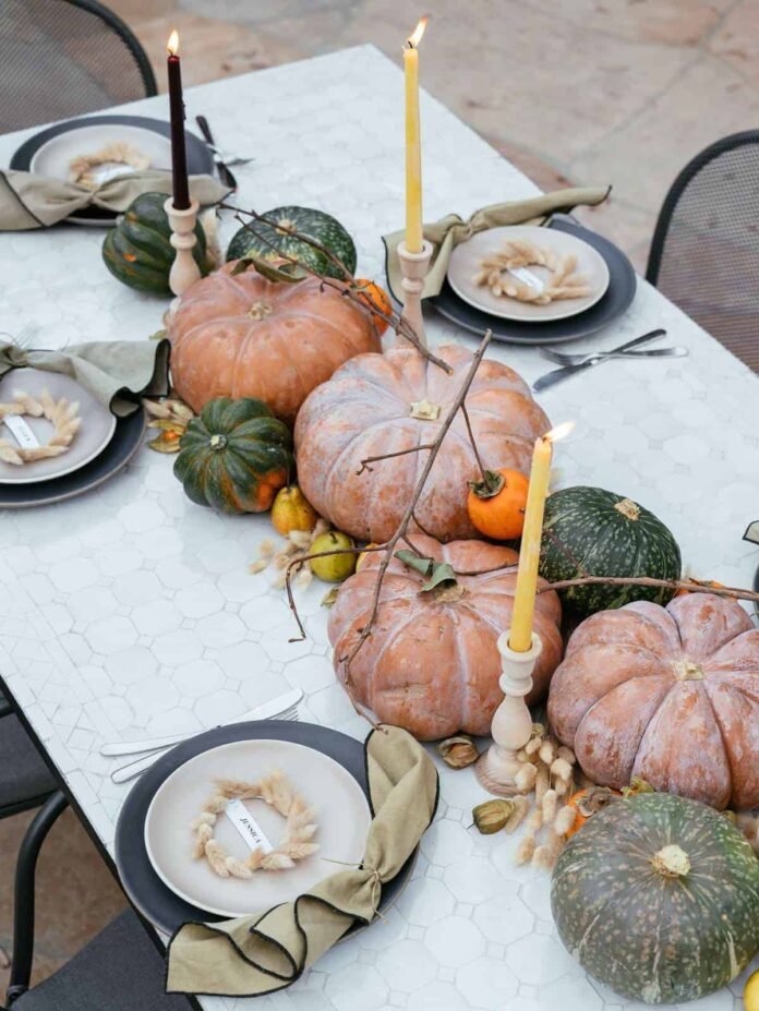 One of my favorite things to do is a dress a table for a special occasion. This year I was so inspired by winter squash that I wanted to really utilize that as the center for my fall inspired tablescape. I wanted to keep the color palate relatively light, and keep the overall theme romantic. I used four big fairytale pumpkins I bought at the grocery store to anchor everything. Then I layered in some squash that I also found at the grocery store, kabocha and acorn.