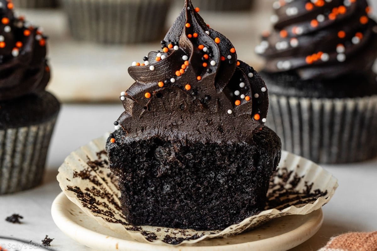 Serious chocolate lovers will adore black velvet cupcakes. These ultra-rich and fudgy chocolate cupcakes get their deep dark hue from black cocoa powder—no black food coloring needed. Just like with red velvet cupcakes, buttermilk and vinegar help create a velvety, tender texture that’s as soft as a kitten… making these the purr-fect choice for Halloween black cat cupcakes! 😉
