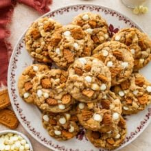 These Brown Butter Oatmeal Biscoff Cookies are chewy, buttery, and packed with melty white chocolate, toffee, and crunchy Biscoff cookies. Bursting with flavor in every bite, they’re a delicious, loaded cookie that’s perfect for the holidays or any time of year.