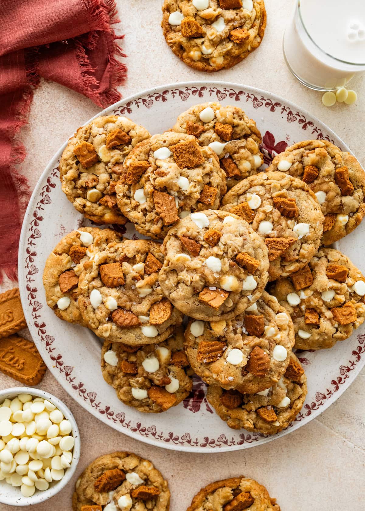 Chewy Brown Butter Oatmeal Biscoff Cookies with toffee and white chocolates: soft, buttery, and packed with flavor! Grab a glass of milk and enjoy!