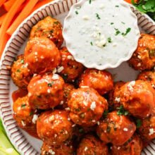 Juicy buffalo chicken meatballs tossed in spicy buffalo sauce and served with creamy blue cheese dip. Perfect for game-day, appetizers, or an easy weeknight dinner.