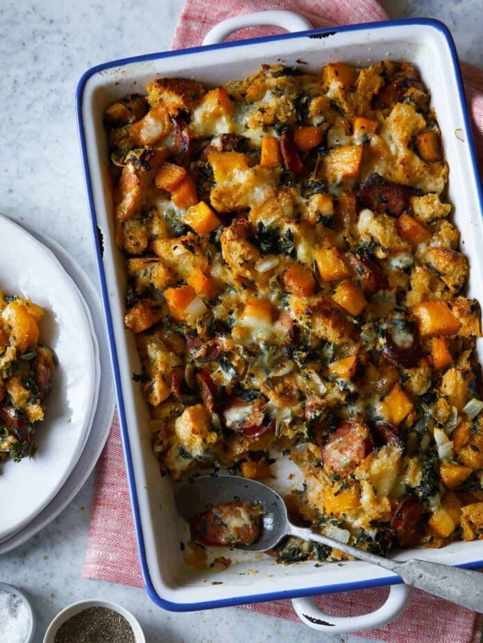 Melt remaining butter and saute onion, garlic and butternut squash until butternut squash has caramelized and just cooked through, 8 to 10 minutes (adding ½ cup water to skillet and covering for a few minutes to steam, if needed). Add spinach and saute for 2 to 3 more minutes or until spinach has wilted. Generously season with salt and pepper.