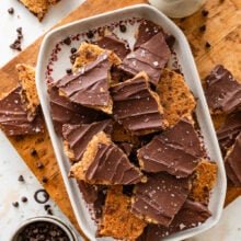Chocolate Chip Cookie Bark is a thin, crispy cookie made with browned butter, topped with melted chocolate and flaky sea salt. An easy, shareable dessert that’s perfect for holidays, parties, and gifting.