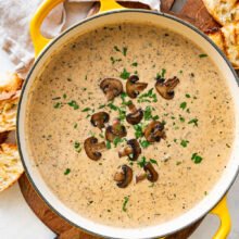 This Creamy Mushroom Soup is rich, velvety, and full of deep savory flavor from cremini mushrooms, white wine, and fresh thyme. Partially blended for the perfect balance of smooth and chunky texture, it’s an easy, comforting soup that’s perfect for dinner or entertaining.