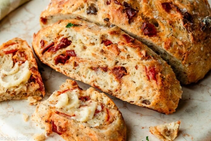 This no-knead pizza bread delivers big flavor with barely any effort. The dough rests and rises overnight, so most of the process is completely hands-off—no kneading or tricky shaping required. The result is a bakery-style loaf with a crispy golden crust and a soft, chewy interior, packed with pepperoni, sun-dried tomatoes, olives, and mozzarella. Add a sprinkle of crushed red pepper for pizzeria-style heat, then serve it warm with pizza sauce or tomato soup for dipping, or slathered in hot honey butter for an extra kick.