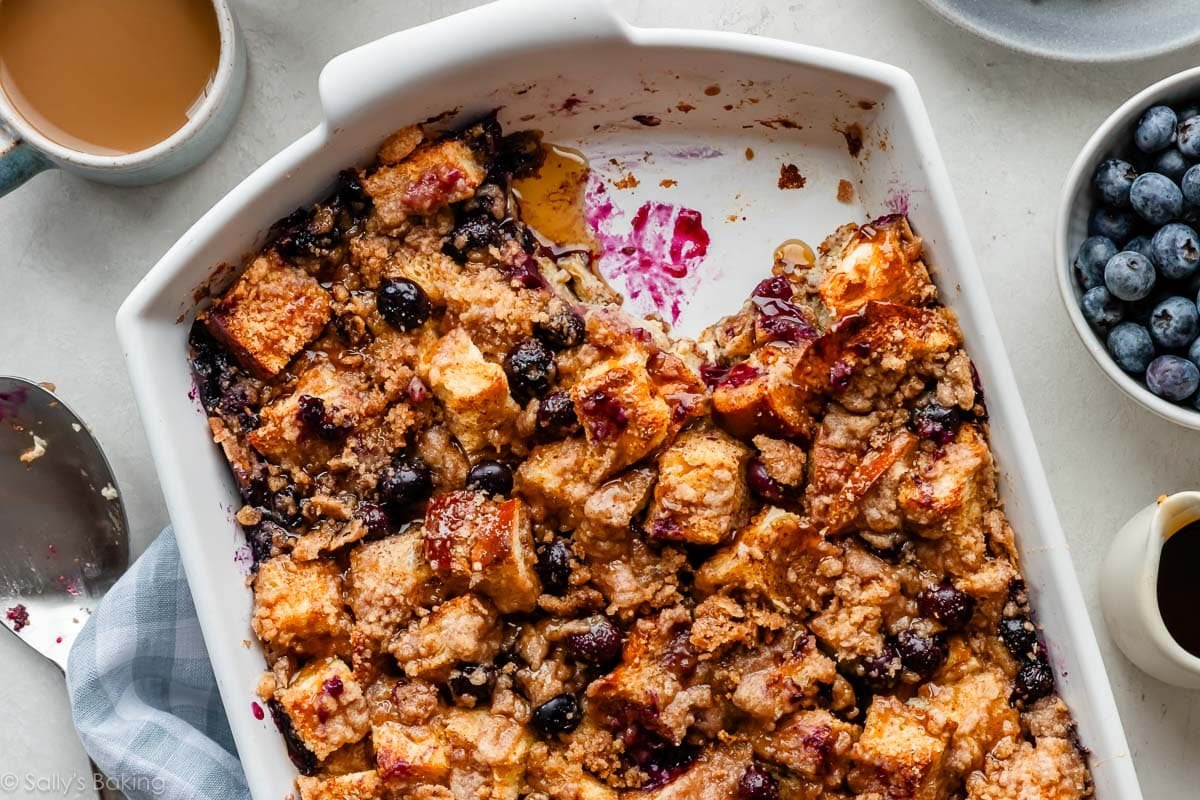 This unbelievable blueberry French toast casserole is made with soft custard-soaked bread, sweet blueberries, and a buttery brown sugar streusel topping. The casserole benefits from sitting in the refrigerator overnight before baking, so this is an excellent make-ahead breakfast recipe! This recipe is also in my cookbook, Sally’s Baking 101.