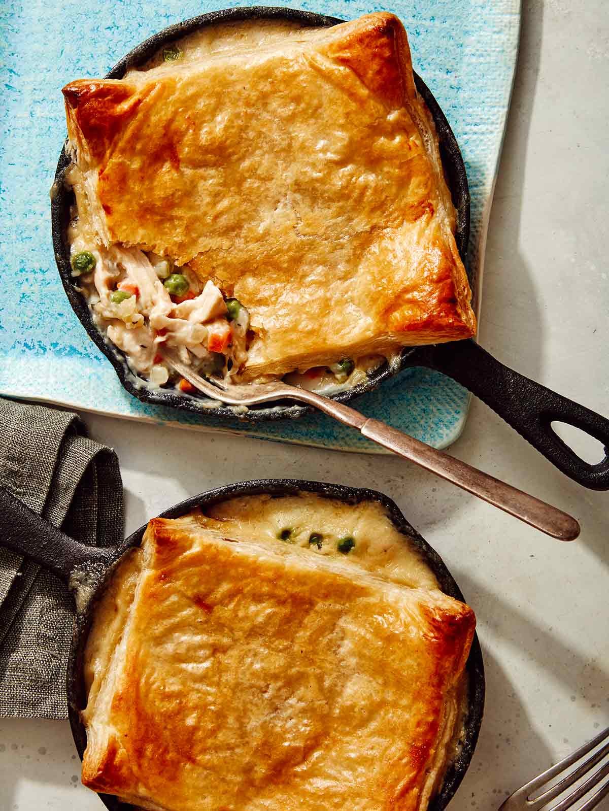 This super easy chicken pot pie uses cooked chicken and puff pastry and cooks in individual cast iron skillets for a simple and tasty dinner for two!