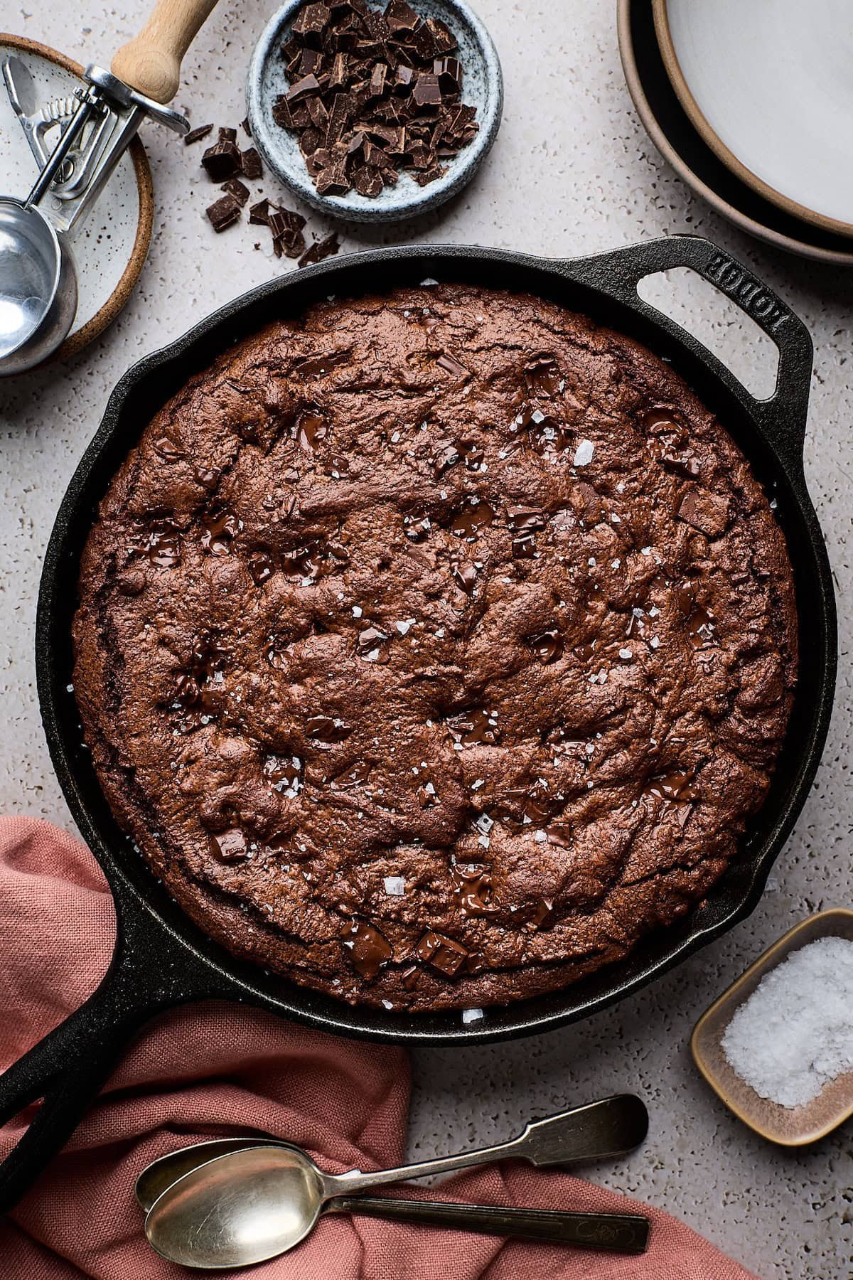 Remove the skillet from the oven and finish with a pinch of flaky sea salt. Allow to cool for 10 minutes, then enjoy warm with your favorite ice cream.