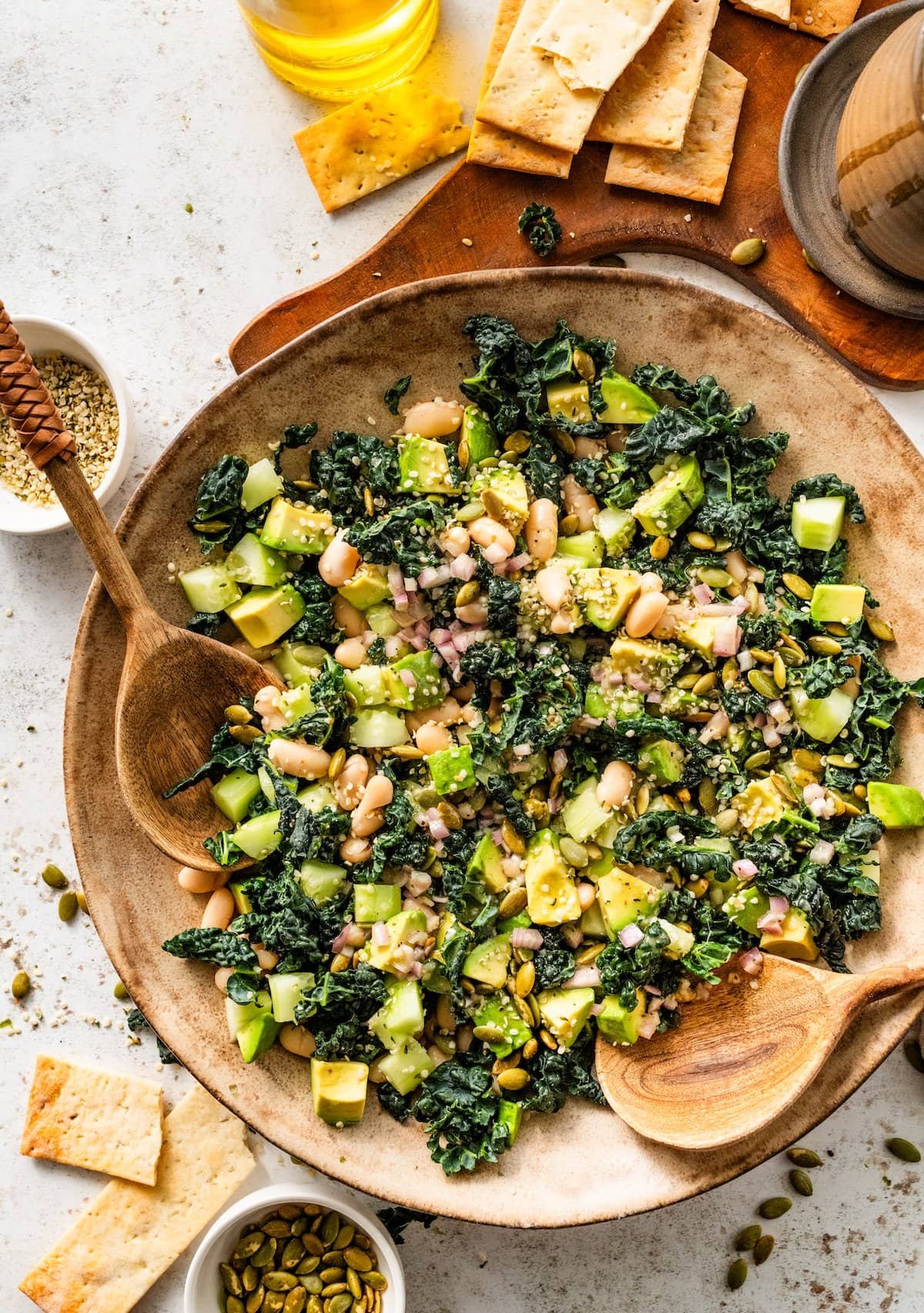 kale and white bean salad with avocado, cucumber, pepitas, and hemp hearts in bowl with wood salad servers. kale and white bean salad with avocado, cucumber, pepitas, and hemp hearts in bowl with wood salad servers.