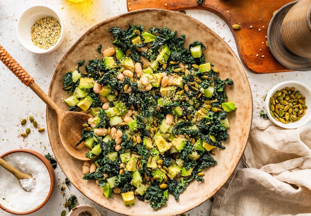 A hearty kale and white bean salad with avocado, cucumber, crunchy pepitas, nutty hemp hearts, and a bright lemon dressing. Inspired by the popular Erewhon salad, this easy recipe is fresh, filling, and perfect for lunch or dinner.