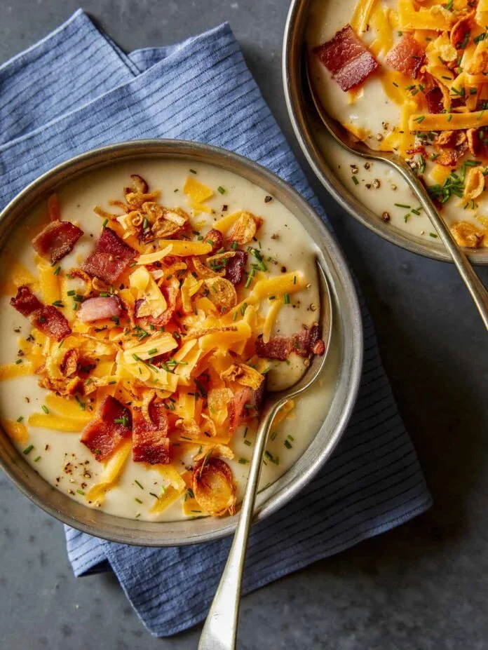Ladle soup into bowls and top with a bunch of shredded cheese, crumbled bacon, sliced chives, and crispy shallots or onions, if using. Finish with more cracked black pepper and serve.