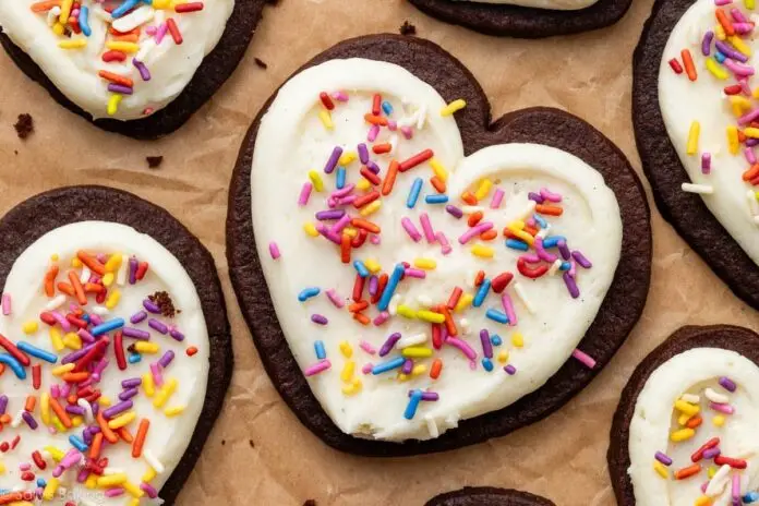 - Make icing or buttercream: Prepare the royal icing, cookie glaze icing, or cookie decorating buttercream, and decorate the cooled cookies however you’d like. I decorated the pictured chocolate sugar cookie hearts with cookie decorating buttercream, piped on with a Wilton 1A piping tip. Then I spread it around to flatten it out, and topped with these sprinkles. This is a classic vanilla buttercream frosting that soft-sets on cookies after a few hours.
