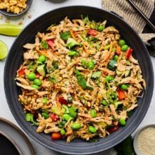The creamy peanut dressing is what sets this salad apart. It’s rich and nutty from peanut butter, brightened with fresh lime juice, and balanced with ginger, garlic, and a touch of sweetness. When tossed with shredded chicken, crisp vegetables, and plenty of fresh herbs, the result is a salad that’s satisfying without feeling heavy.