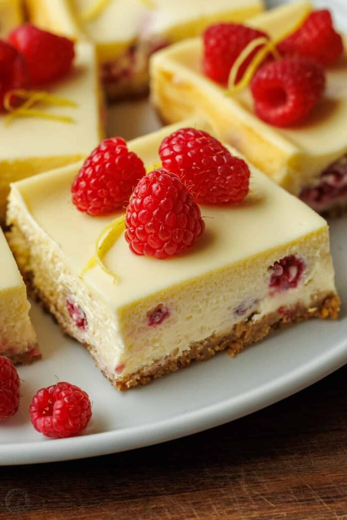 Serve – Carefully lift the chilled cheesecake out using the parchment overhang. Slice into bars and serve garnished with fresh raspberries and lemon zest ribbons.